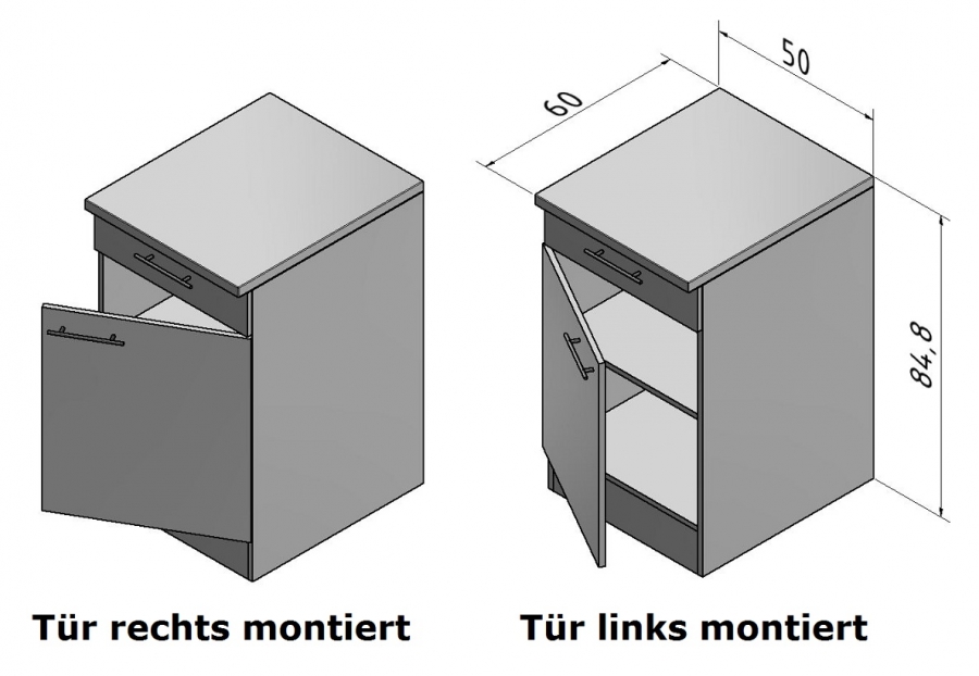 Damit du beim Aufbau deiner Küche flexibel bist, sind die Schrank-Türen so vorbereitet, dass sie beidseitig montiert werden können. Da wir Arbeitsplatten ohne Ausschnitte für Spüle und Kochfeld liefern, können alle Schränke variabel gestellt werden. Die Einlegeböden in den Schränken sind höhenverstellbar.Farbausführungen