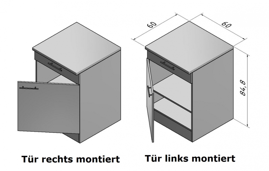 Damit du beim Aufbau deiner Küche flexibel bist, sind die Schrank-Türen so vorbereitet, dass sie beidseitig montiert werden können. Da wir Arbeitsplatten ohne Ausschnitte für Spüle und Kochfeld liefern, können alle Schränke variabel gestellt werden. Die Einlegeböden in den Schränken sind höhenverstellbar.Farbausführungen